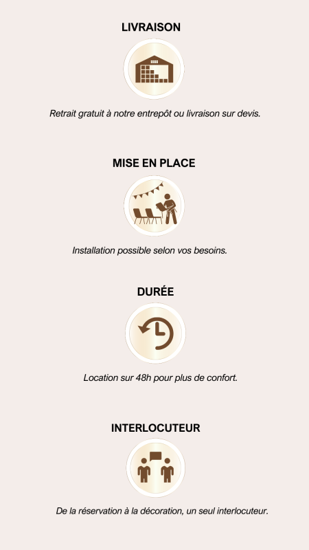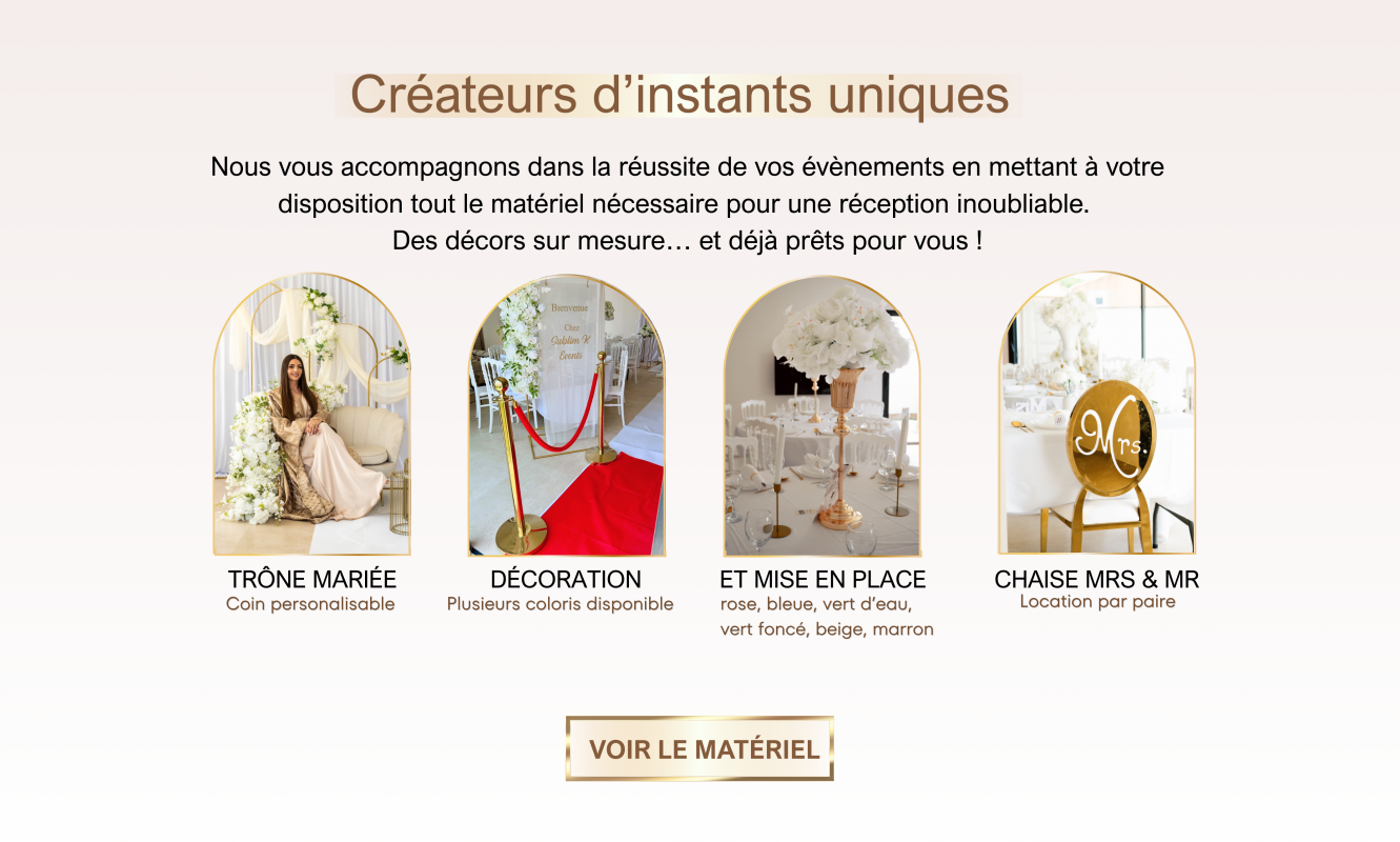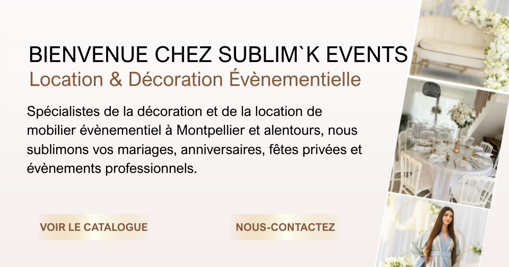 « Pour mon mariage, nous avons reçu le matériel directement chez nous. Tout était parfait : tables, chaises, décorations. Je recommande Sublim K Events ! »