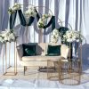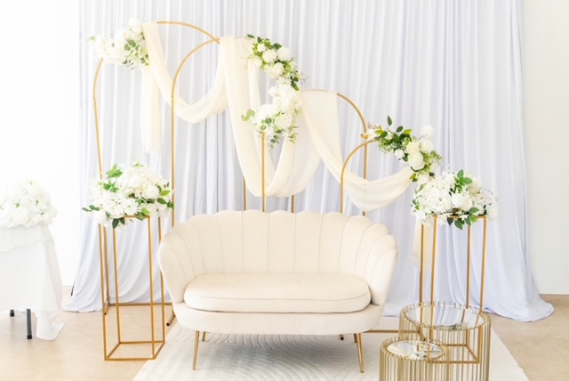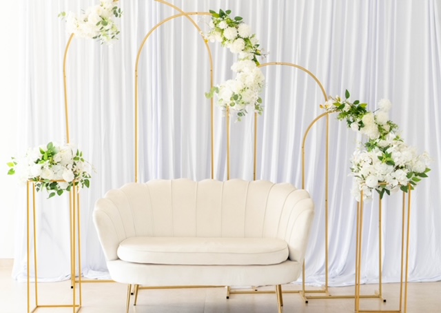 4 arches dorée + table basse + 2 supports dorée & 2 fleurs + voilage sur les arches + 2 coussins