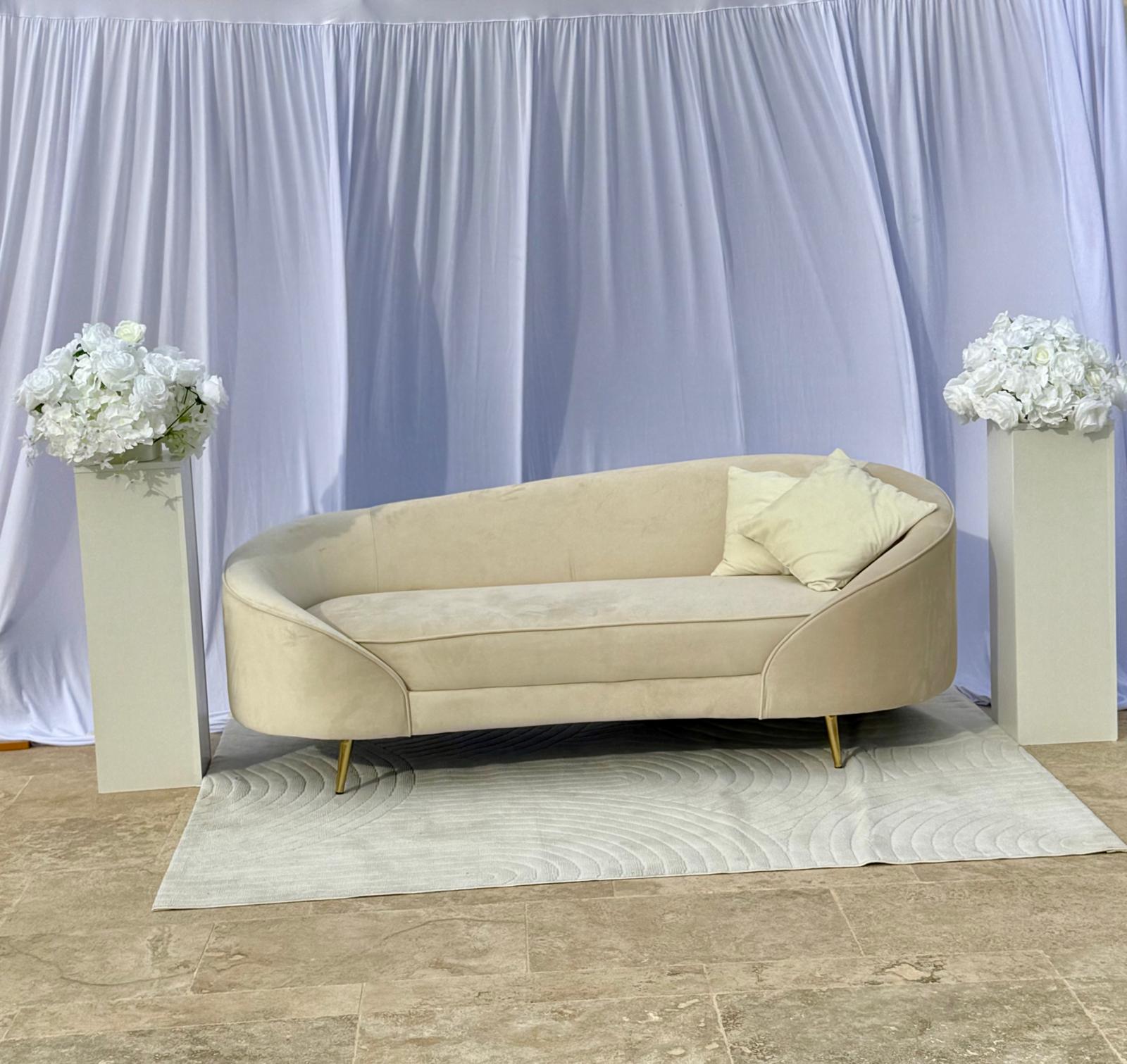 Trône Siena + tapis + 2 supports blanc & 2 fleurs + structure 2,50m max de hauteur & 2,50 m max de largeur + rideau blanc à l’arrière + 2 coussins